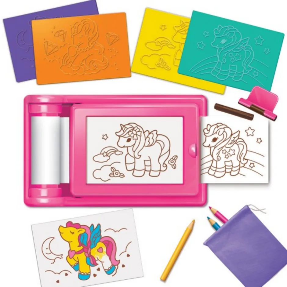 Es un entretenido estudio de arte donde podrás hacer diferentes dibujos de dinosaurios con las plantillas que se incluyen, sólo debes poner la plantilla y colocar el papel encima, usa el rodillo y comenzará aparecer tu dibujo, podrás cortarlo y seguir dibujando