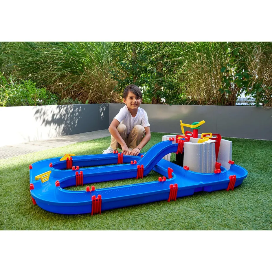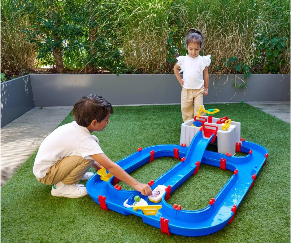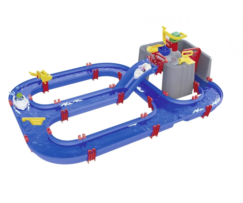 Emocionante estación acuática – La vía acuática del puerto con detalles lúdicos como una grúa, una potente bomba de agua y las compuertas impermeables y típicas de AquaPlay harán las delicias de los niños y niñas a partir de 3 años.