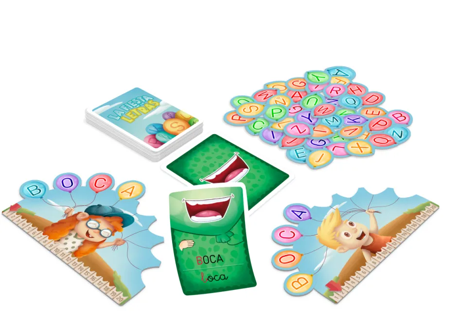- CONTENIDO: 4 tableros de jugador. 4 marcadores de puntos. 88 globos con letras. 96 cartas con 3 niveles de dificultad. 1 carta de Fiesta de las letras. 1 libro de instrucciones y guía con 10 modos de juego.