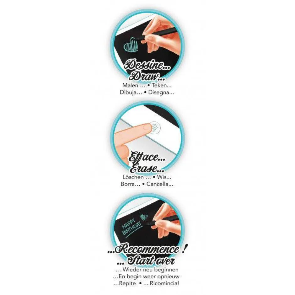 Utiliza tu tableta y tu puntero para dibujar y anotar todo lo que se te ocurra. Con el modo encendido, podrás dibujar y pulsar la tecla de borrar para que la imagen desaparezca y así comenzar de nuevo; si prefieres mantenerla intacta, elige el modo bloqueo para más seguridad. Los trazos son claros y muy vistosos, y animan a dibujar y dibujar sin descanso. ¡Alucina con el resultado!