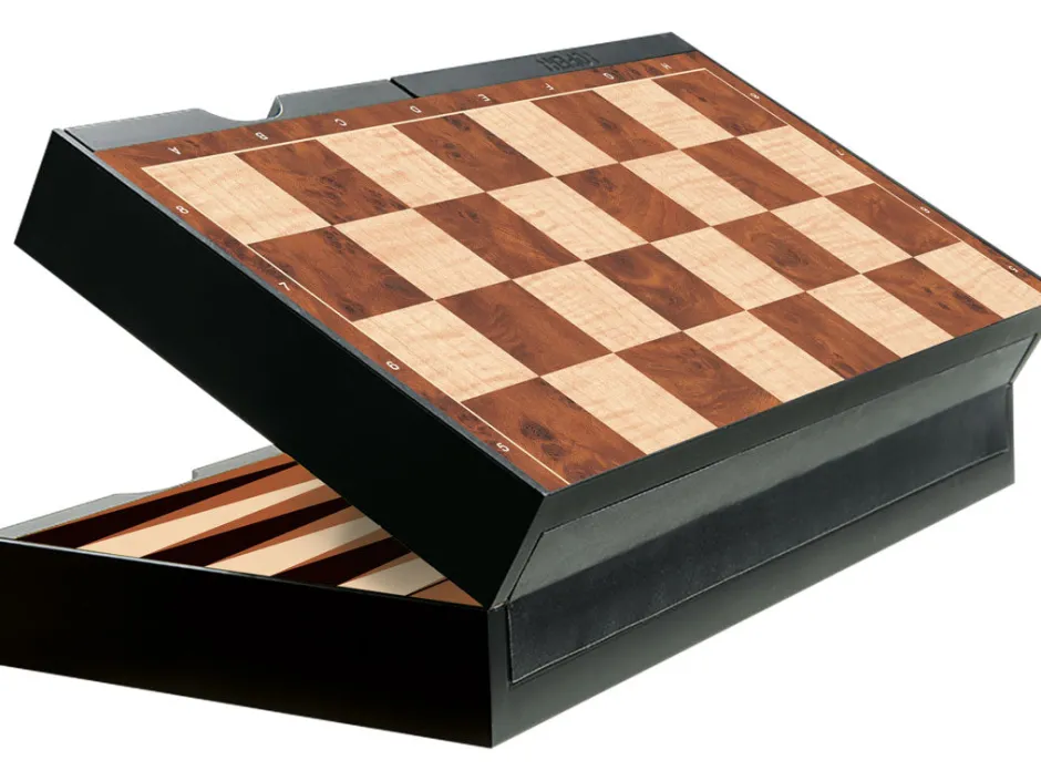 Con esta compacta caja podrás jugar a 3 juegos diferentes, ajedrez, damas y backgammon. Las fichas (magnéticas) están alojadas en los cajones y dependiendo en la posición que coloques el tablero de juego, podrás o no abrir el cajón.