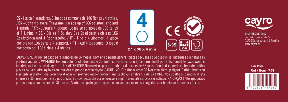 Tamaño de la ficha: 2,7 x 3,8 x 0,4cm.