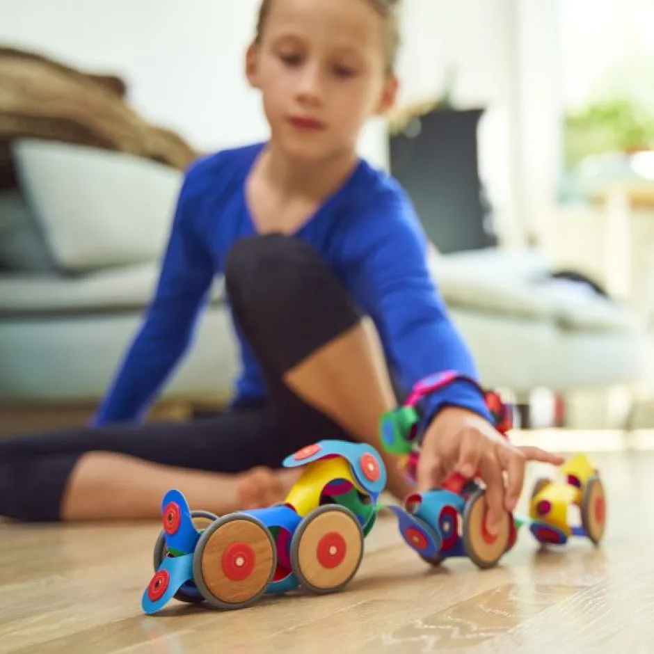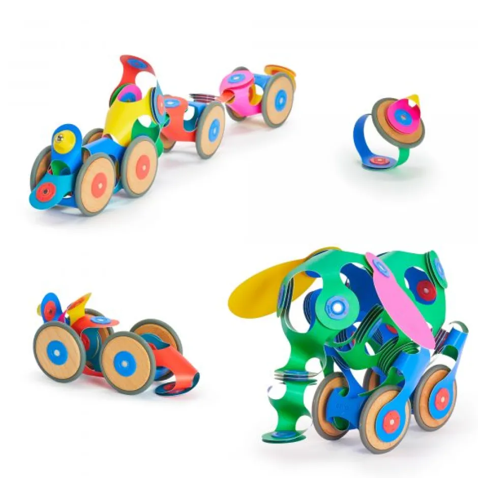 Este pack tiene 72 piezas en 10 formas únicas de CLIXO, incluidas ruedas y soportes. Las ruedas permiten llevar la experiencia de construcción al movimiento y la velocidad. Ya sea que haga clic en las ruedas de un automóvil o de un tren, de un pavo real rodante o de un elefante veloz, este pack lleva a los niños a descubrimientos creativos en movimiento.