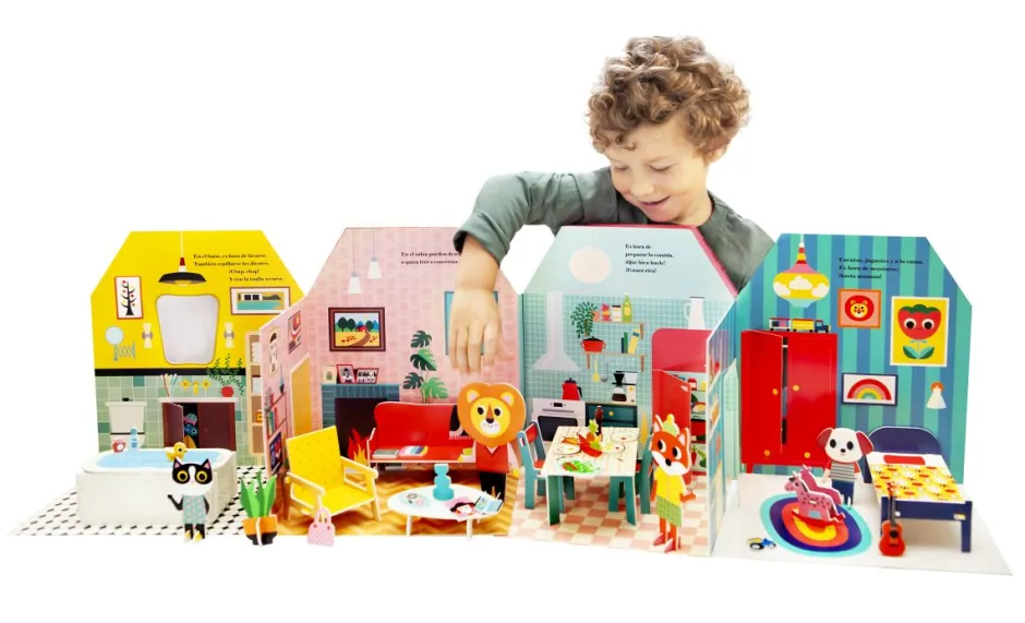 Esta espectacular casa de muñecas desplegable tiene cuatro habitaciones diferentes, muebles en tres dimensiones, personajes y pegatinas para decorar cada estancia. Presenta un formato perfecto para los que tienen poco espacio o para llevar de viaje, ya que las piezas se pueden guardar dentro del resistente cajón que hay en el lateral del libro.