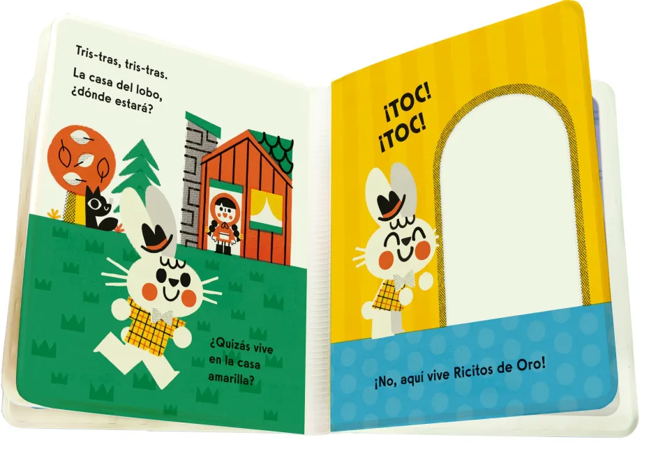 populares. Para encontrarlo, el conejito llama a la puerta de Ricitos de Oro, de los tres cerditos y de Caperucita Roja. Un libro de baño ilustrado por Pintachán, con elementos escondidos que quedan al descubierto cuando se mojan.