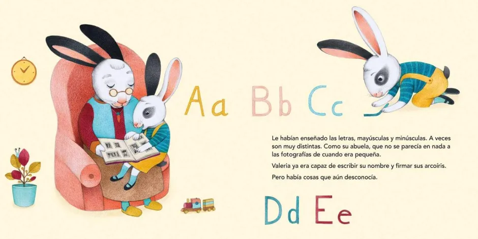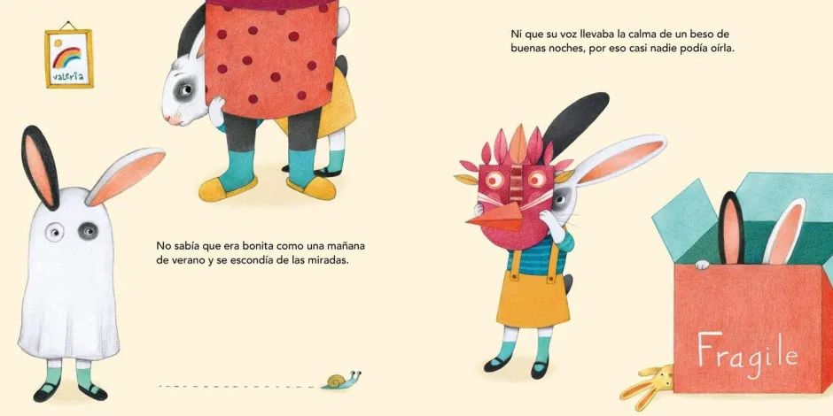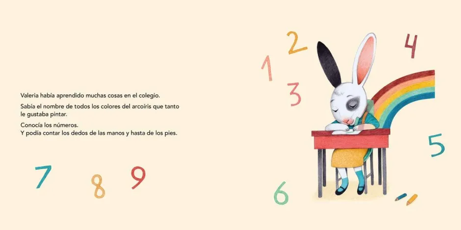 Valeria es una pequeña conejita que le encanta aprender e ir a la escuela. Se lo pasa en grande contando con todos los dedos de su mano y decir en voz alta los nombres de los colores que conforman el arcoíris. Sin embargo, Valeria es muy muy tímida y por eso intenta llamar la atención lo menos posible y hablar bajito para que no la oigan. No sabía el poder que tenía su risa y la sujetaba con firmeza para no dejarla escapar, ni tampoco conocía la fuerza que llevaban su beso y su abrazo, por eso los mantenía bien guardados.