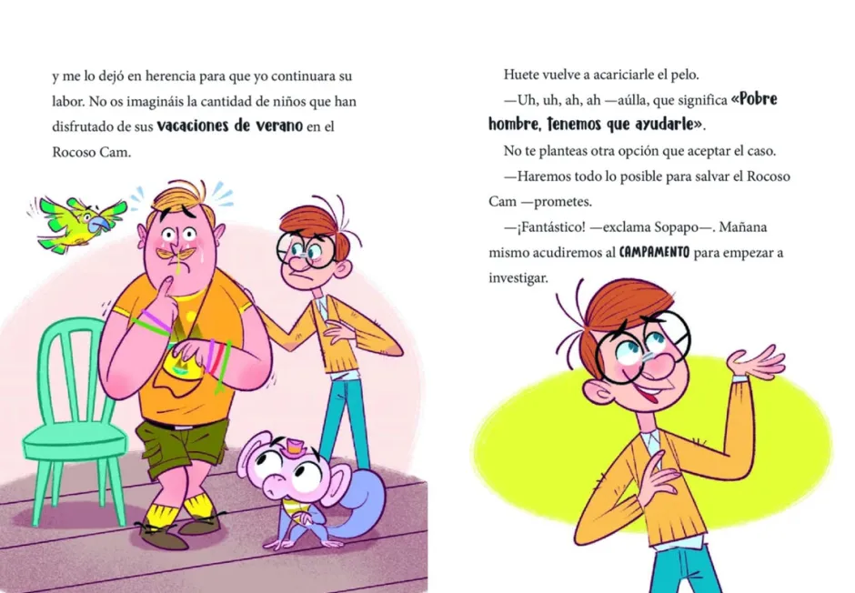 Tu vecino, el Detective Sopapo, tiene un gran corazón… pero ¡es un desastre como detective! Con su fiel (y travieso) mono Huete, necesita tu ayuda para salvar un campamento de verano en el que suceden cosas muy extrañas… En cada página, tú decides qué hacer. ¿Seguirás una pista en el bosque? ¿Interrogarás a los campistas? ¿Montarás guardia o te arriesgarás en una misión nocturna?