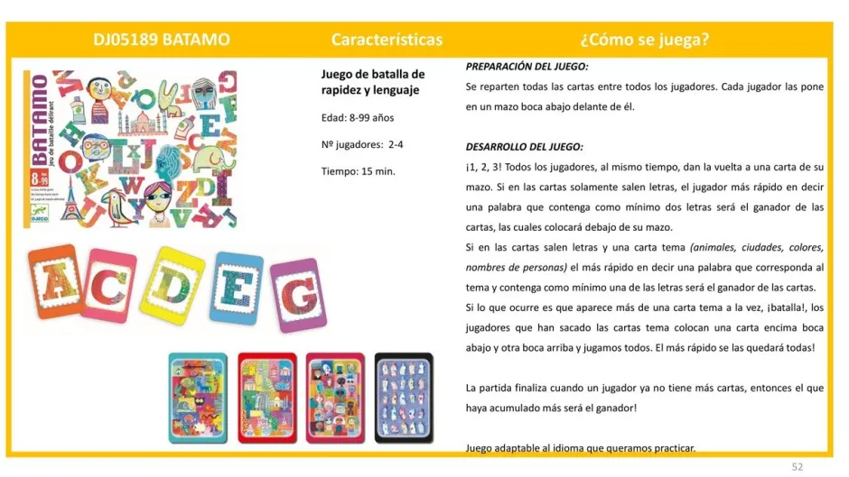 Un juego de batalla revisitado con palabras! En este caso, no hay cartas con mayor valor: los jugadores compiten en una carrera por la primera palabra encontrada siguiendo las letras y los temas de las cartas dadas la vuelta… ¡Las risas están garantizadas!