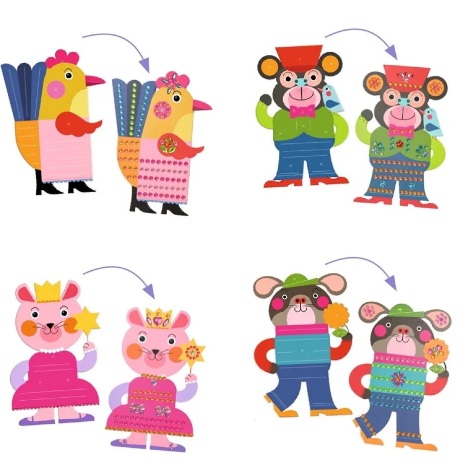 Una actividad de collage para decorar 4 animales con piedrecitas brillantes. Es muy fácil: las piedritas están unidas entre sí y cuando el niño saca una, ¡vienen también todas las demás que necesita! Luego las pega en su tarjeta. Una vez terminada la actividad, los 4 animales se iluminan, ¡para deleite de los peques!