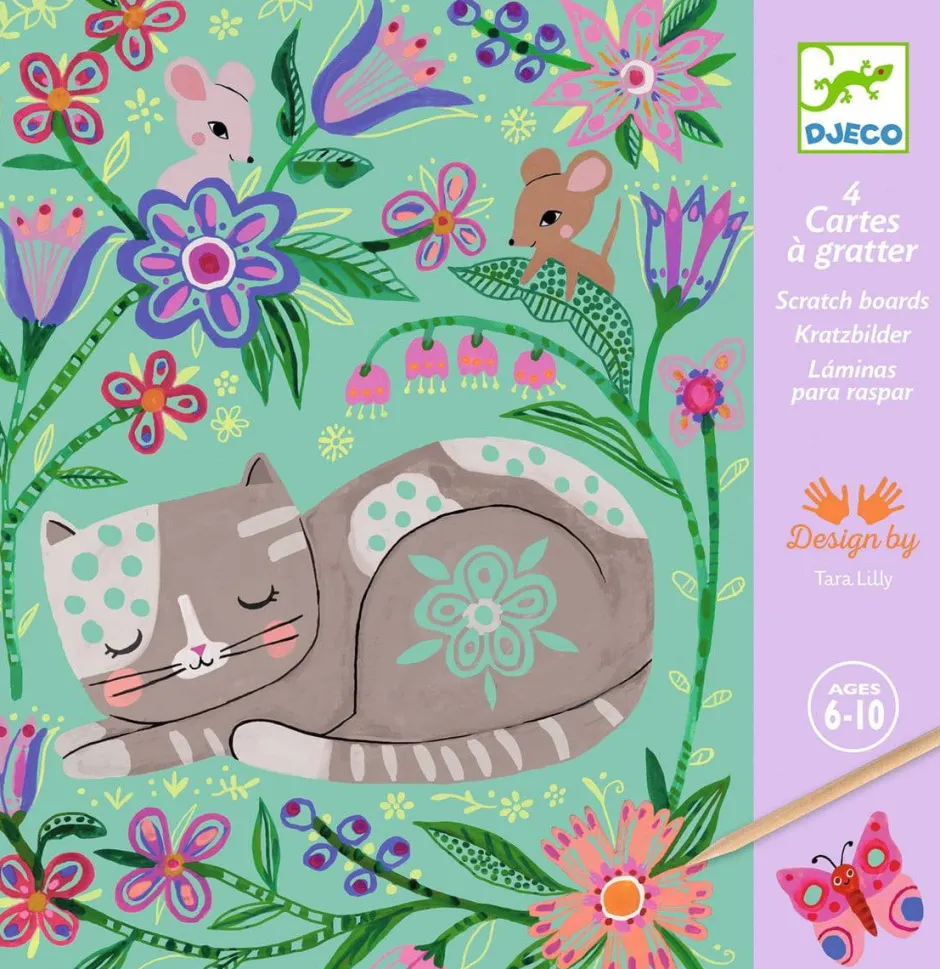 Un estuche de 4 tarjetas para rascar con adorables ilustraciones: los animales del jardín se encuentran en una decoración floral. El niño reproduce los dibujos imaginados por el artista raspando la superficie con el punzón