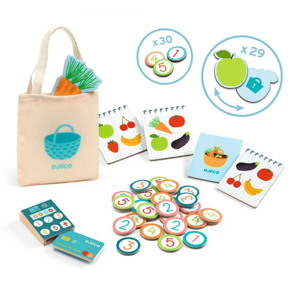 Conviértete en el dueño del puesto de frutas y verduras de nuestro mercado imaginario, ¡y vende a tus clientes tus mejores piezas! O haz de cliente y llévate a casa las frutas más deliciosas sin gastarte todo el dinero, ¡invita a tus amigos a jugar a las tiendas!