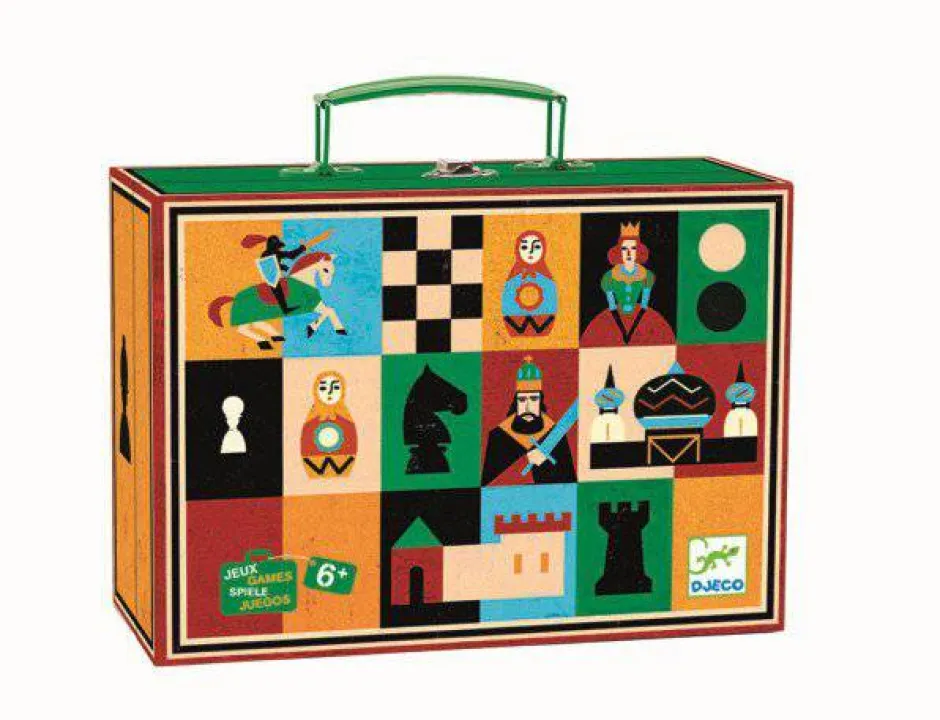 Un maletín con un juego de ajedrez y otro de damas con piezas de madera y un cuadernillo de iniciación. 2 juegos clásicos e imprescindibles en 1. Todo en un bonito maletín ilustrado para guardar y transportar los juegos.