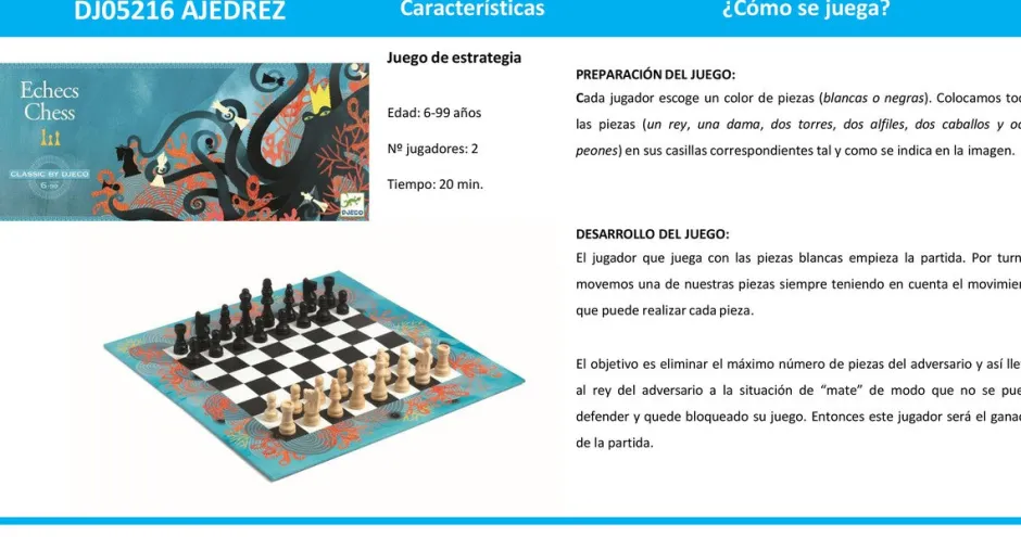 Djeco reversiona el imprescindible ajedrez con un tablero adornado con el fondo submarino. ¡Hay que sumergirse en las profundidades de la estrategia para intentar ganar la partida!