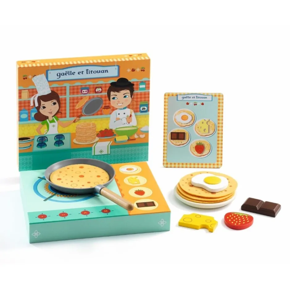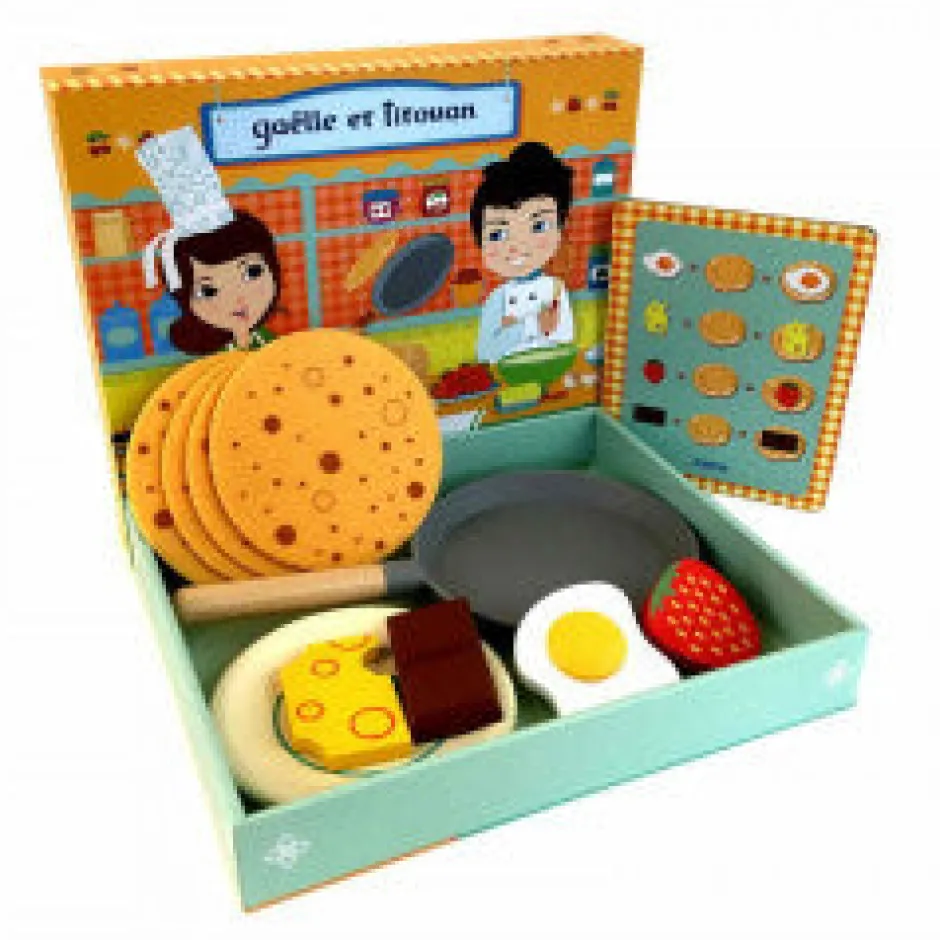 Las crepes saltan en la sartén, ¡qué divertido! En una hermosa caja de madera, todos los accesorios necesarios para preparar deliciosas crepes dulces y saladas.