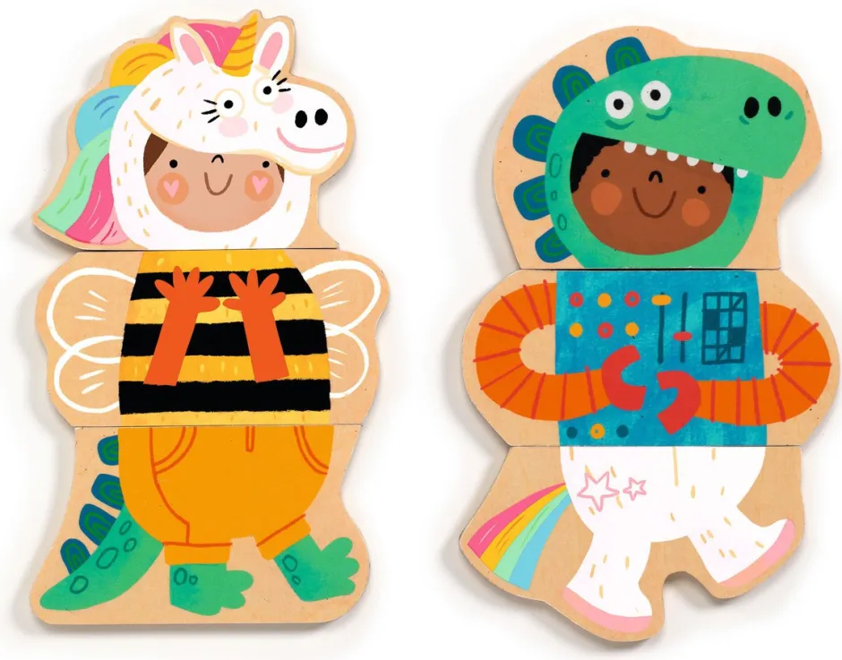 Caja de 24 piezas magnéticas de madera para formar niños disfrazados o imaginar otros más divertidos. ¡El niño ayuda al cosmonauta a recuperar su cuerpo y sus piernas!