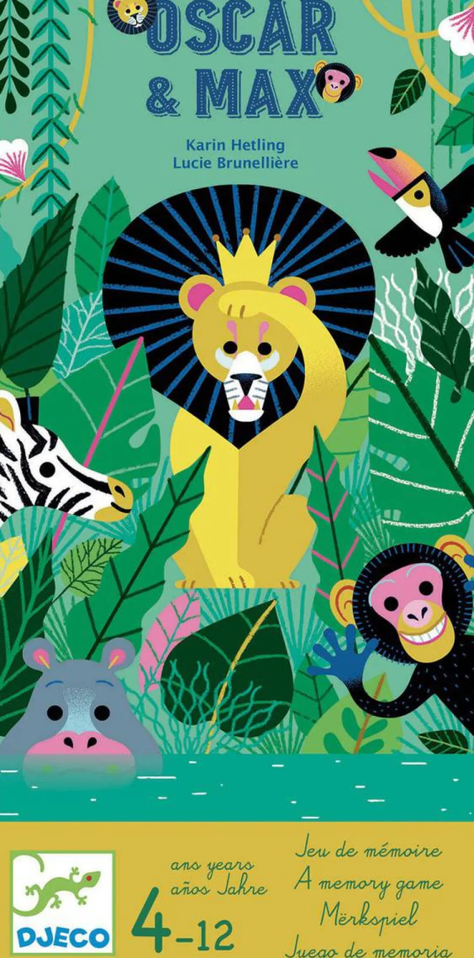 Oscar y Max es un juego de cartas de memoria y azar para 2-4 jugadores a partir de los 4 años.