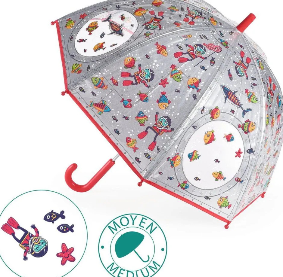 ¡Un paraguas moderno y práctico con detalles submarinos y un mundo submarino para descubrir a través de los ojos de buey! Apertura manual, con sistema de seguridad para que los niños puedan abrir y cerrar sin pillarse los dedos..