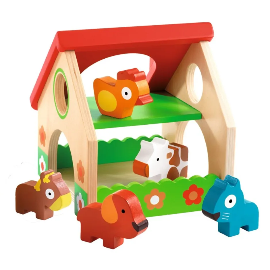Una granja de madera pequeña y bien decorada, que alberga 5 animales: un perro, un gato, un caballo, una vaca y una gallina.