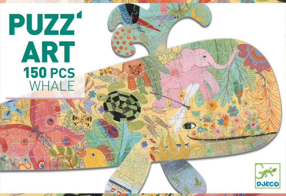 Puzz’Art Ballena es un puzle de 150 piezas. Gracias a su formato inédito, sin esquinas ni bordes, se derriban los códigos del arte del puzle. A través de esta gran silueta perforada, el niño descubre una ballena.