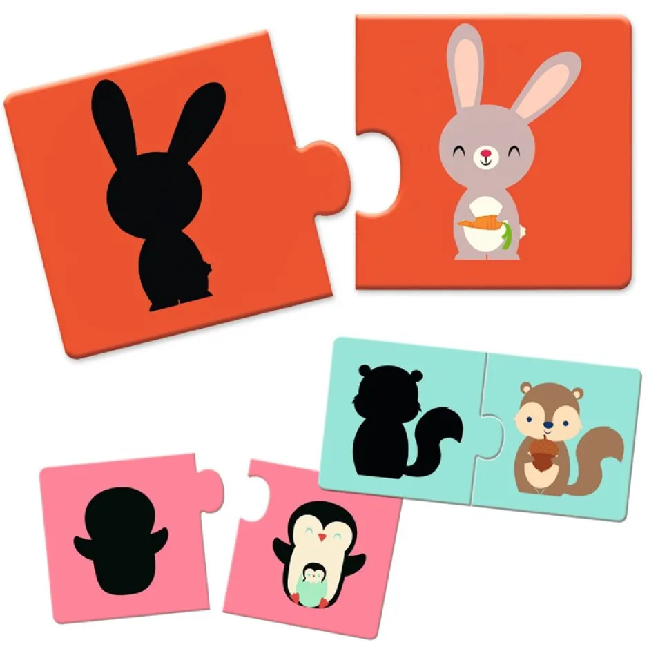 Puzzle duo Sombras es un puzle educativo en el que el niño debe asociar animales de colores con su sombra.