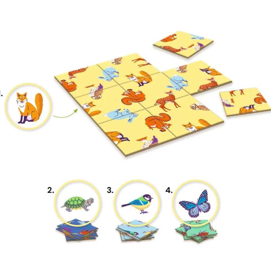 Basado en el concepto del dominó de colocar piezas adyacentes que muestren el mismo dibujo o bien que completen un diseño dividido entre dos pieza (como en este caso), tendremos que observar y resolver con paciencia y lógica cada uno de los retos, haciendo que coincidan las mitades de los animales del bosque correctamente para completar las imágenes y, por lo tanto, cada uno de los retos.