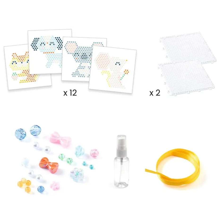 Una caja maxi con más de 2300 cuentas de agua para crear 12 modelos de animalitos muy tiernos: 6 pequeños, 2 medianos y 4 grandes, con 3 niveles de dificultad. Incluye 2 placas de trabajo para poder alternar las tareas y numerosas cintas y colgantes para convertir tus creaciones en amuletos de la suerte que podrás colgar en cualquier lugar.