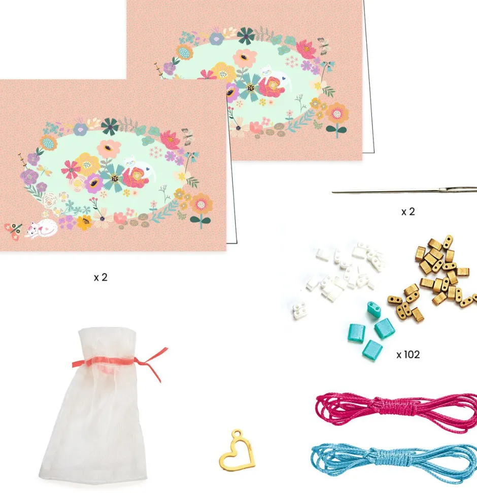 En una bonita caja brillante, una variedad de cuentas y amuletos de flores para crear 2 pulseras con los colores de la primavera. 2 joyas para guardar o regalar en una bonita bolsa de organza. Y para aún más recuerdos, se incluyen dos tarjetas con imágenes para escribir un bonito mensaje.