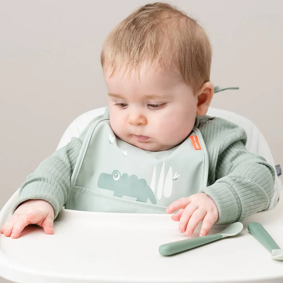 Pack de 2 baberos con bolsillo recogemigas. 100% polyester revestido con PU.