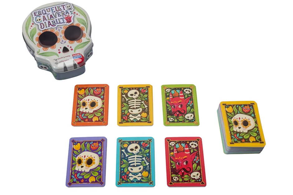 En nuestro turno, repitiendo en voz alta la secuencia «Esqueleto, calavera, diablito», procedemos a descartar la carta superior de nuestro mazo de cartas: primero el Esqueleto, seguido de la Calavera y finalmente el Diablito.