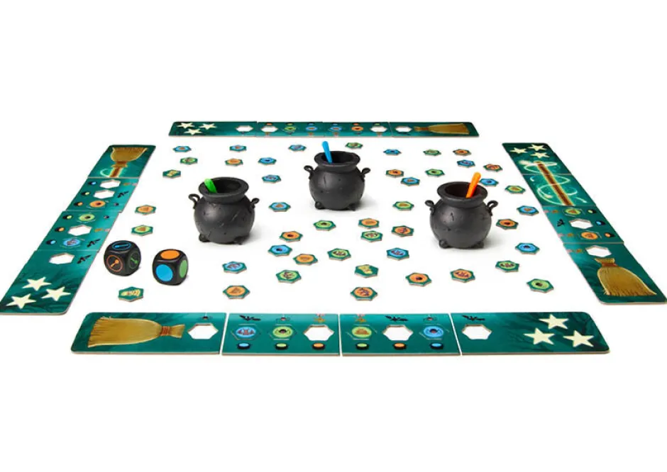 Abracada Broom es un juego de mesa de memoria adaptable y toma de decisiones con ingredientes mágicos, poderosas pociones y escobas voladoras.