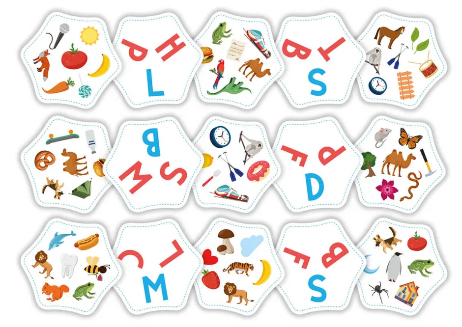 Se forma una pila en el centro de la mesa, con todas las cartas con las letras hacia arriba. El primero/a en encontrar un enlace, es decir, en asociar una letra con un objeto, colocar la mano encima de la carta y decir la palabra correctamente, se lleva la carta.