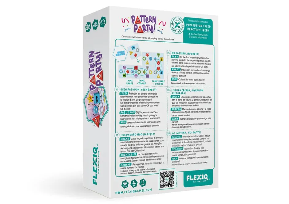 Pattern Party es un juego de mesa en el que niños, niñas y adultos competirán por ver quién es el más rápido relacionando todas sus cartas y encontrando el nexo en común entre si, buscando el vínculo que comparten ortogonalmente, ya sea repitiendo el mismo color, la misma forma o ambas.