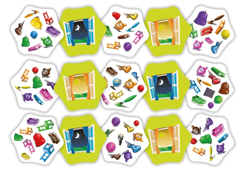 Uno de los jugadores dará vuelta la primera carta de la pila, y en función de si la carta indica día o noche, el resto de los jugadores deberán ser los primeros en localizar el color u objeto correcto en la carta girada para ganar dicha carta.