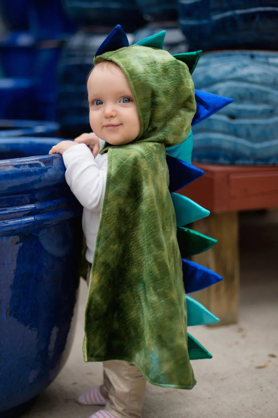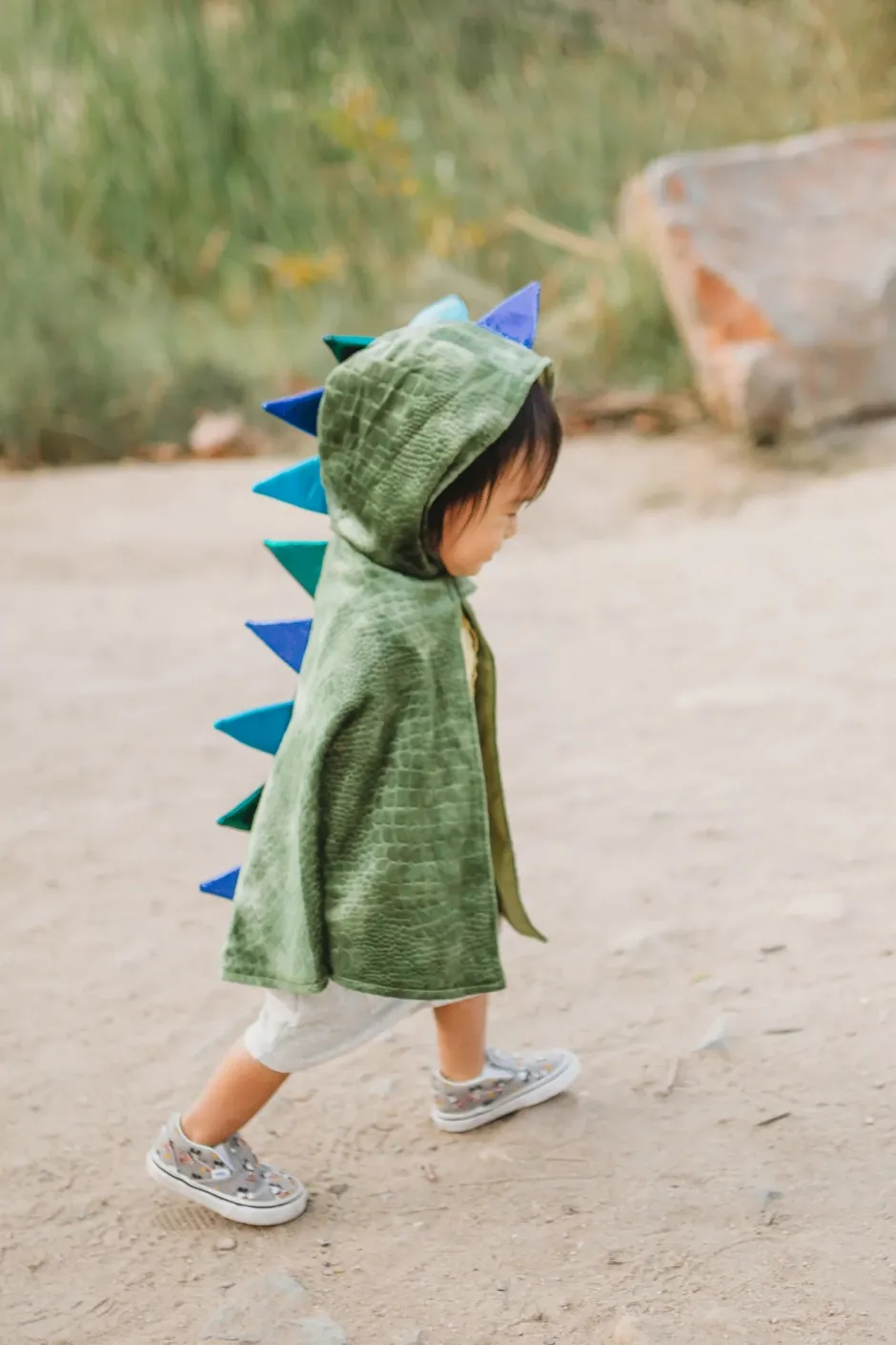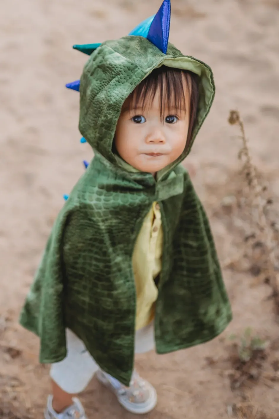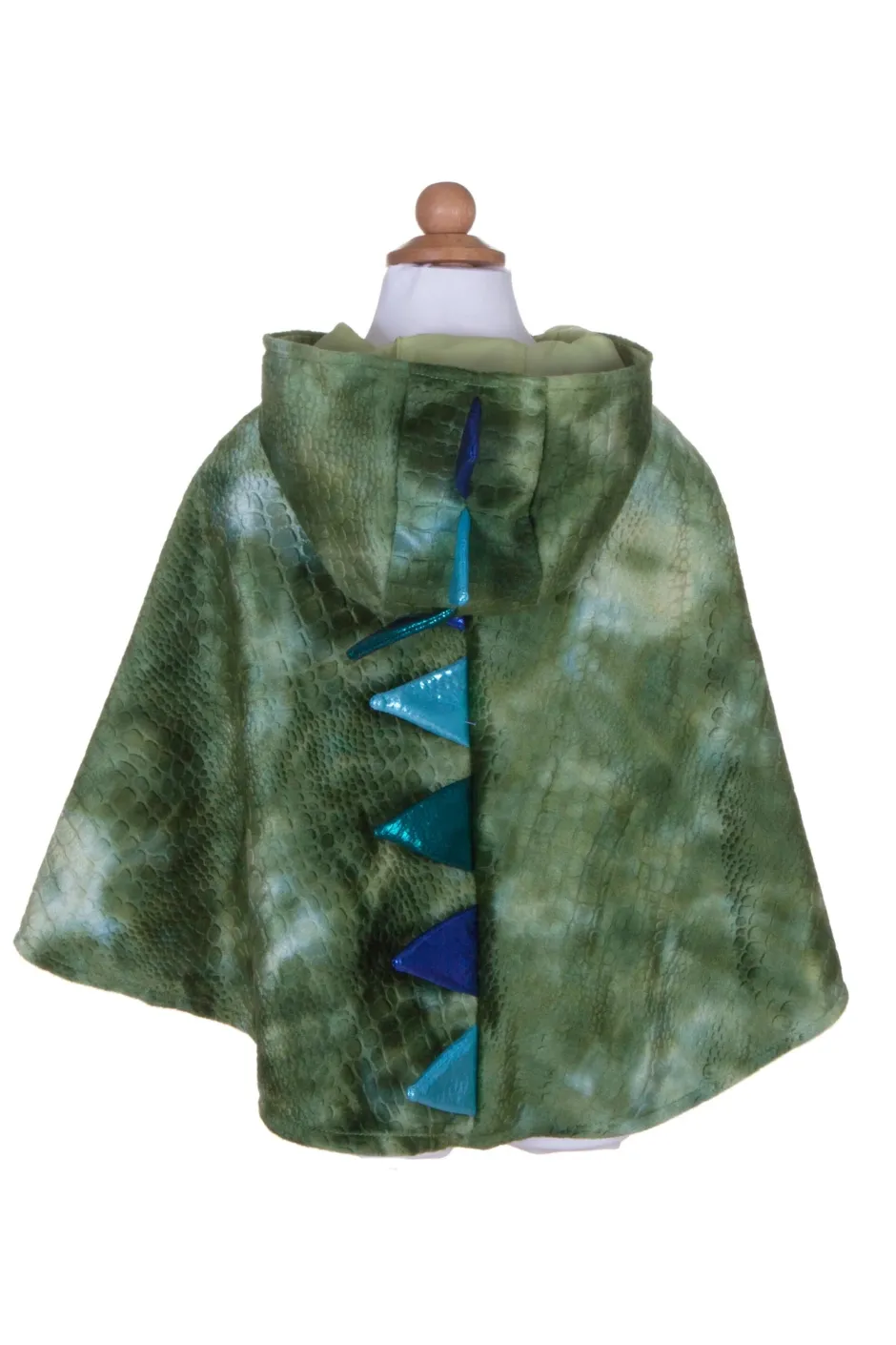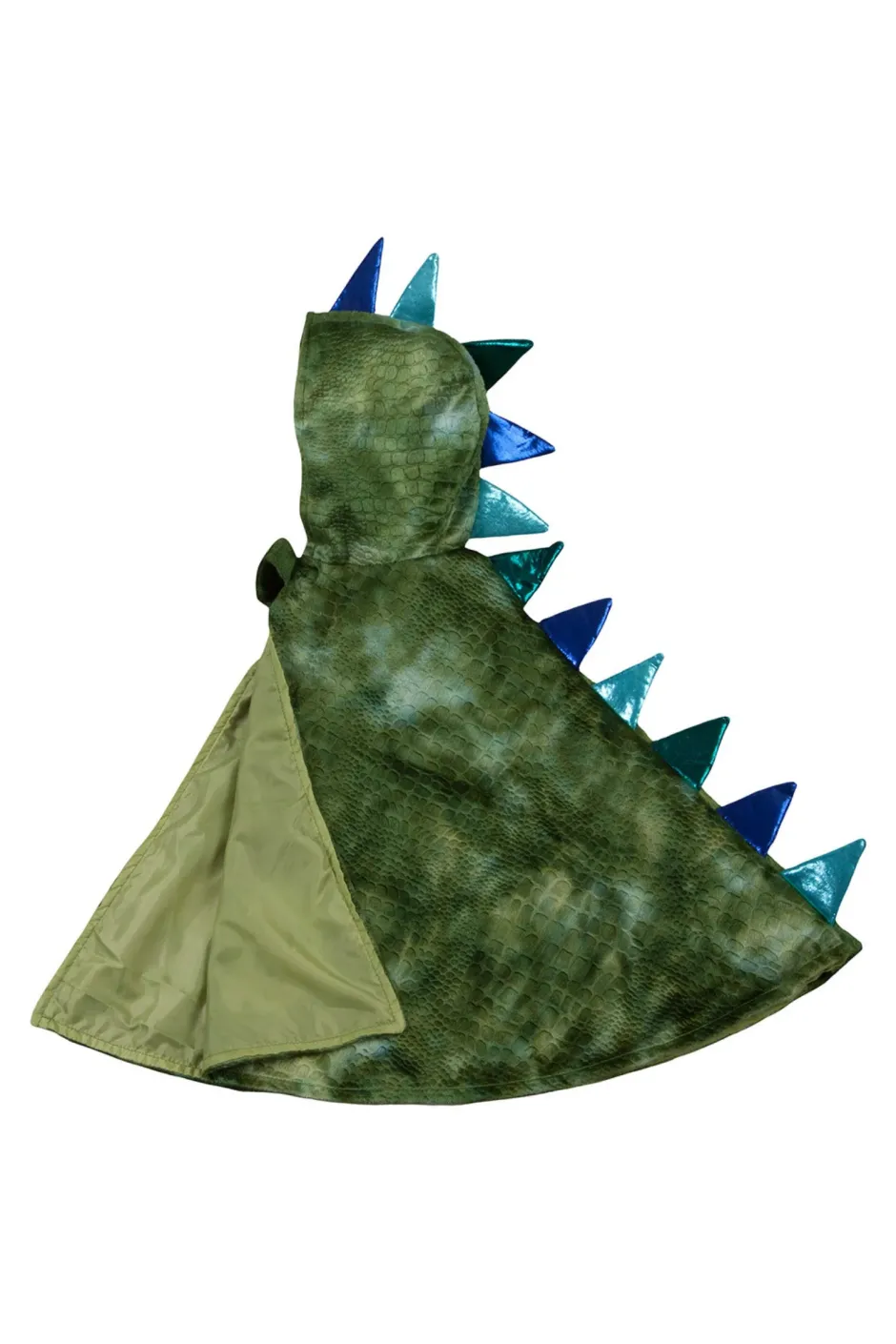 Capa metálica con acabado escamado, garras adheridas y capucha con picos, diseñada para juegos feroces y creativos. Interiores suaves y cierre velcro para mayor comodidad.