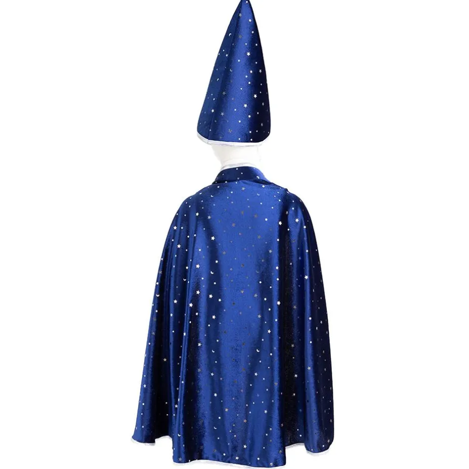Con estrellas y lunas estampadas con purpurina plateada sobre un terciopelo azul medianoche intenso. Este conjunto de 2 piezas incluye un sombrero de mago puntiagudo con una correa elástica para la barbilla y una capa para una apariencia completa y mágica. Capa con cierre de velcro para ponérsela y quitársela fácilmente.