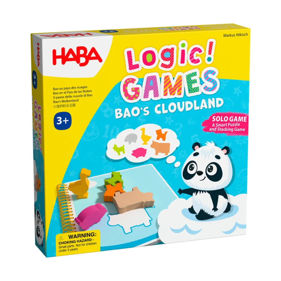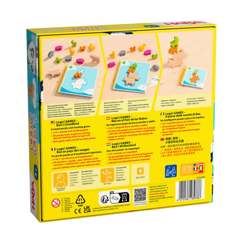 A la osa panda Bao le encanta mirar el cielo y dar rienda suelta a su imaginación. Esa nube de ahí recuerda a una vaca y dos cabras inclinando la cabeza. Los niños/as salen a explorar el País de las Nubes con Bao. Descifran las diferentes formas, hacen un puzzle con los animales adecuados y los apilan como corresponda. Para ello, necesitan tener buen ojo y un pulso firma. El grado de dificultad de los 60 puzzles y los 60 retos de apilado aumenta con cada ronda. ¿Quién conseguirá resolverlos todos? Diversión inteligente haciendo puzzles mientras se explora el País de las Nubes… ¿Quién logrará colocar correctamente los animales de madera en las formas de nube y apilarlos como corresponda?
