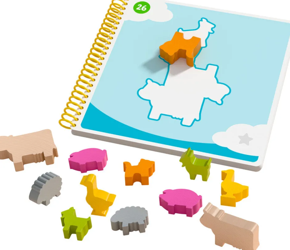CONTENIDO: 12 animales de madera de colores (2 vacas, 2 cerdos, 2 ovejas, 2 cabras, 2 gansos, 2 gatos), 1 cuaderno de anillas grande con 60 retos de puzzles (incluye hojas con pegatinas), 1 cuaderno de anillas pequeño con las correspondientes soluciones (y lo mismo con los retos de apilado), 1 instrucciones del juego