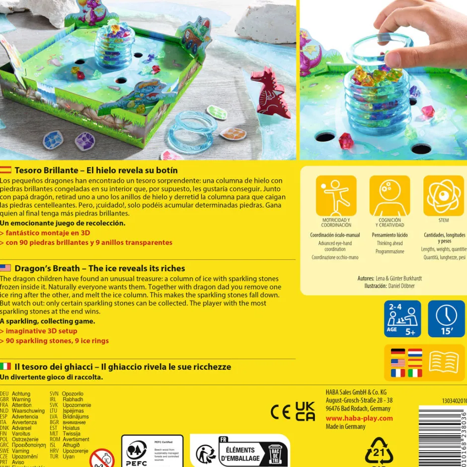Contenido: 1 papá-dragón, 1 planta (parte inferior de la caja) con 4 separadores, 1 tablero, 4chicos-dragón, 9 anillos de hielo, 90 piedras brillantes (18 piedras en 5 colores), 5 fichas-piedra, 1 ficha-hielo, 1 instrucciones del juego.