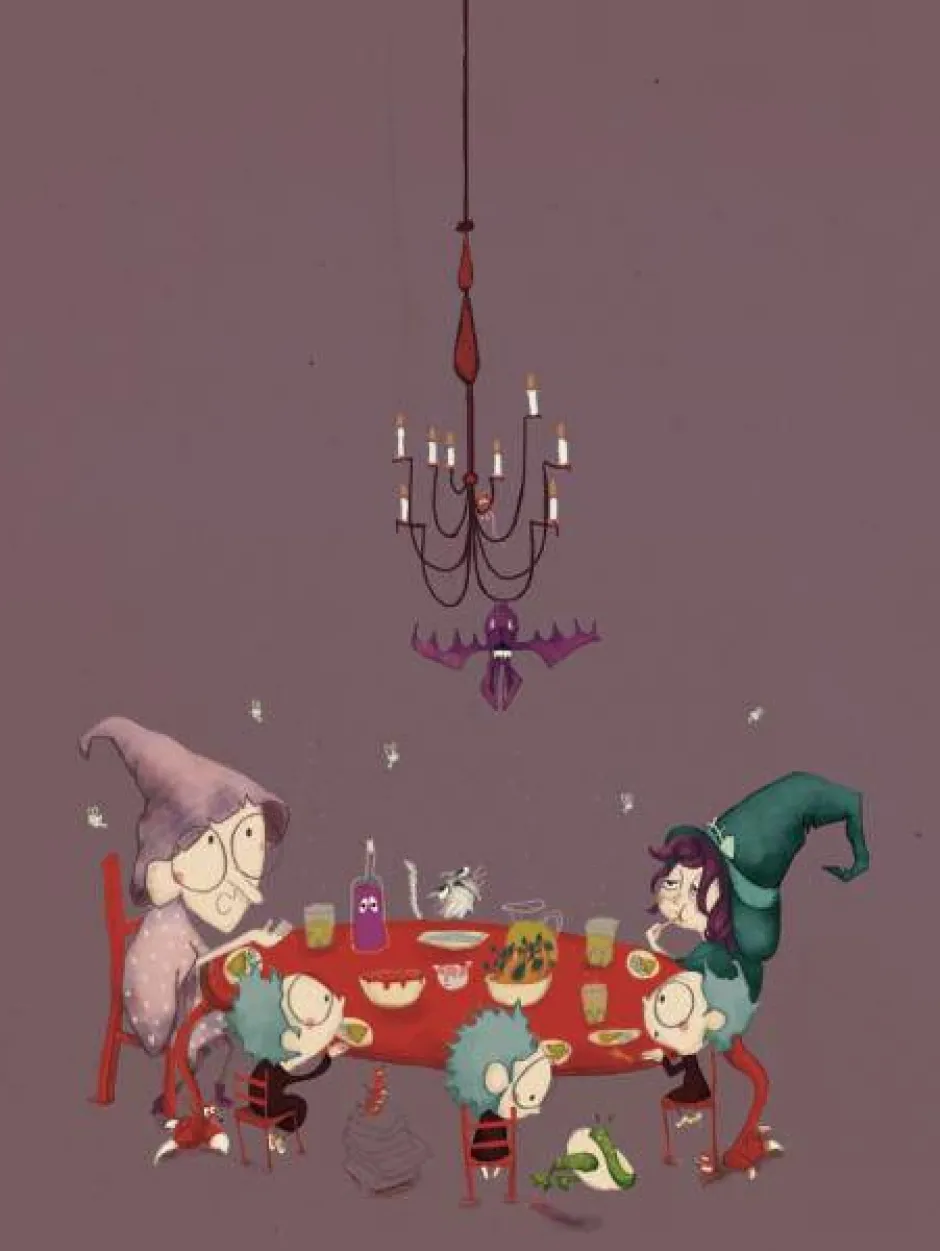 Mamá Bruja está agotadísima… Cuando llega del trabajo tiene que desorganizar toda la casa… Es agotador que los niños lleguen limpios del cole y tener que ensuciarlos…, cocinar comida podrida y no tener ni un ratito para mirar su bola de cristal.