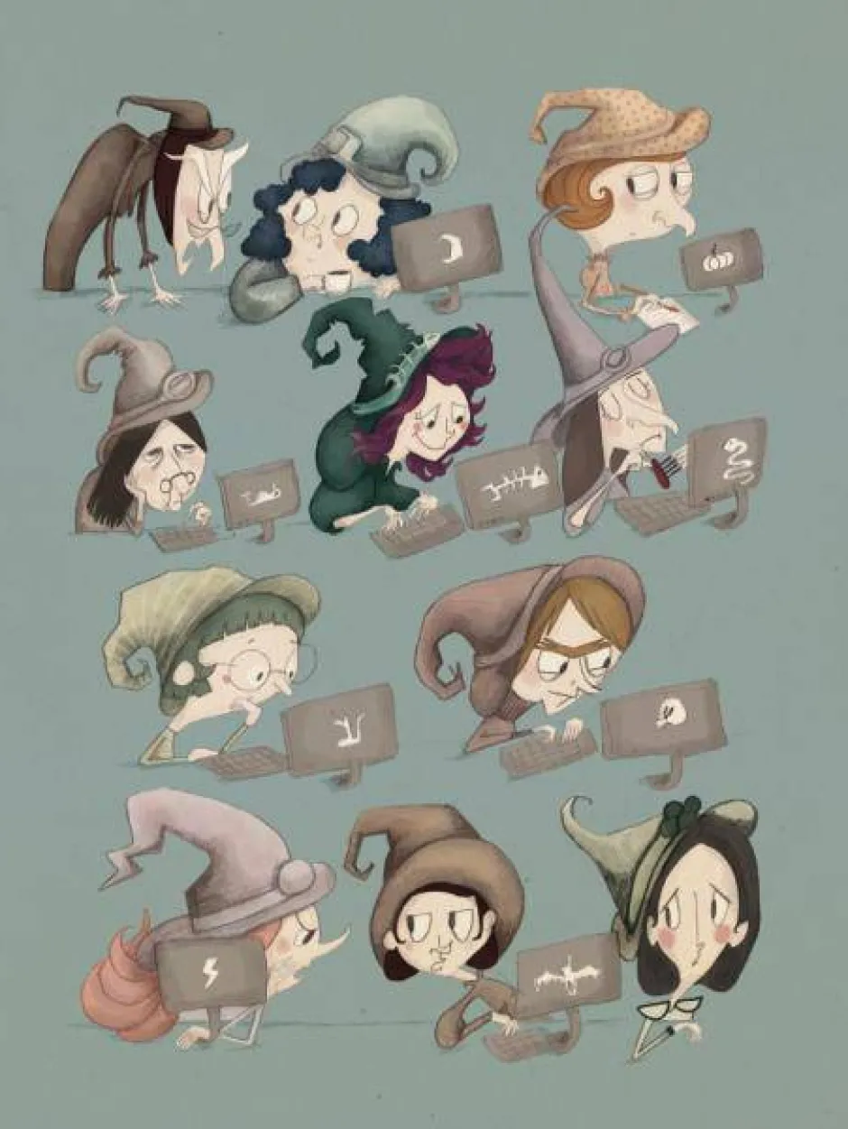 ¡Mamá Bruja no para! Trabaja en el Ministerio de Mimiedo y vive con sus trillizos, el despistado Atronado, el gato Despeluzado, 17 ratones lectores y muchas arañas tejedoras.