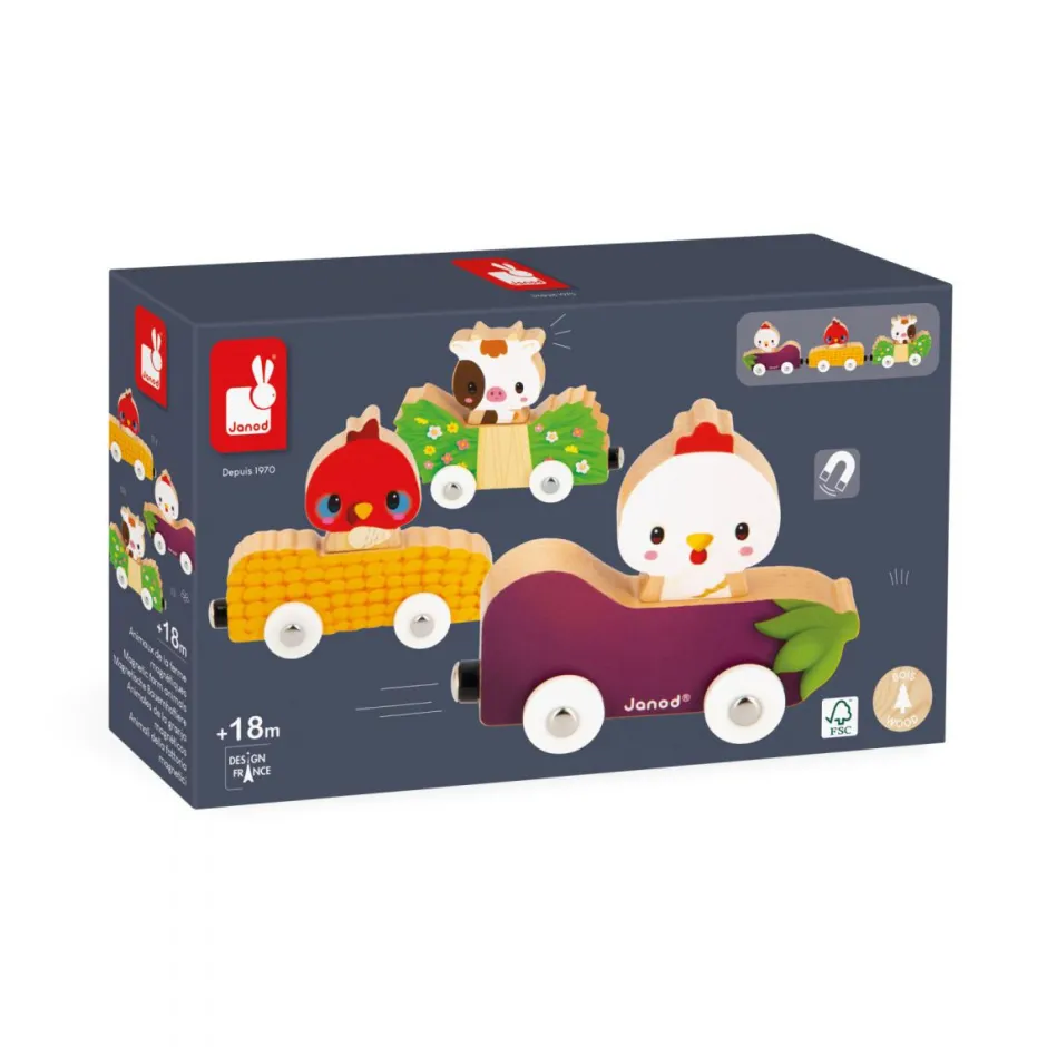 ¡Embárcate en una aventura con una vaca, un pavo y una gallina ! Cada animal tiene su propio coche con la imagen de su comida favorita, ¡qué divertido! Gracias a los imanes, los animales se adhieren a su coche y son intercambiables. Así tu hijo podrá intercambiar los animales en los vehículos y por qué no, colocar el conejo en el carro de queso y el perro en el carro de zanahoria. Para permanecer juntos durante todo el viaje, estos pequeños coches están equipados con imanes que se mueven uno detrás del otro. ¡Perfecto para desarrollar la imaginación! Juguete magnético de madera FSCTM.