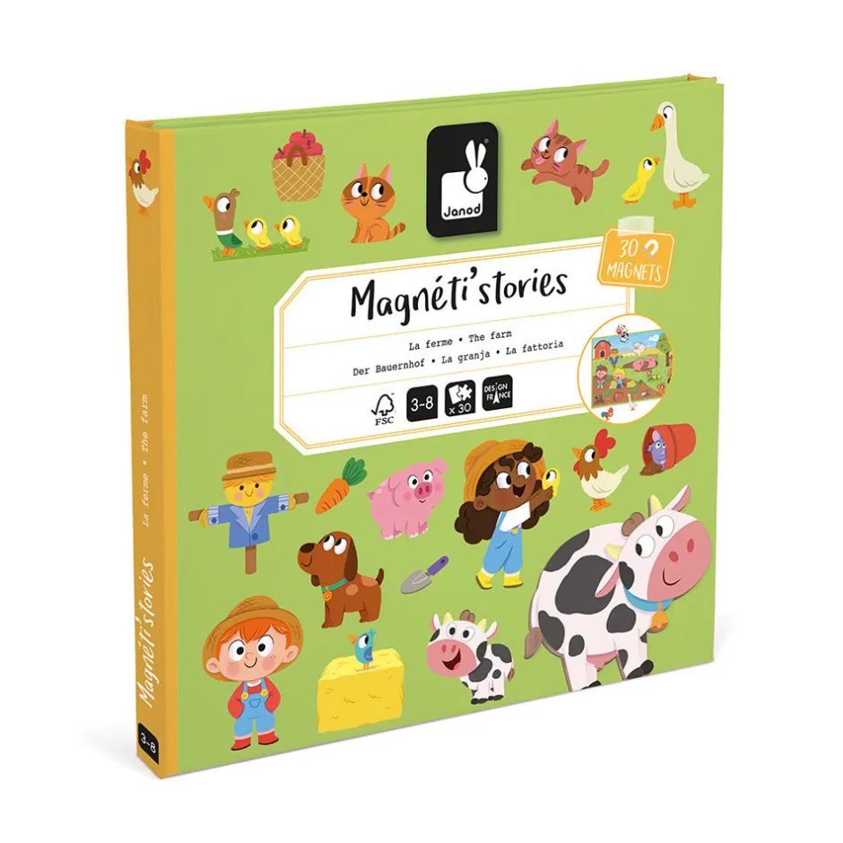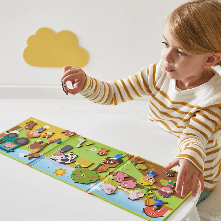 La motricidad fina, fundamental en los primeros aprendizajes de los niños, se trabaja al agarrar las piezas magnéticas. La imaginación no se queda atrás: cada imán, una vez puesto en el decorado, invita al niño a inventarse sus propias historias. Los cerditos se revuelcan en el barro, las ovejitas saltan la valla, el granjero se va a cosechar subido en su tractor verde… ¡Un montón de divertidas escenas que cobrarán vida en la cabeza del pequeño! ¡Y es genial porque el decorado se puede poner en vertical para que el niño te cuente sus historias!
