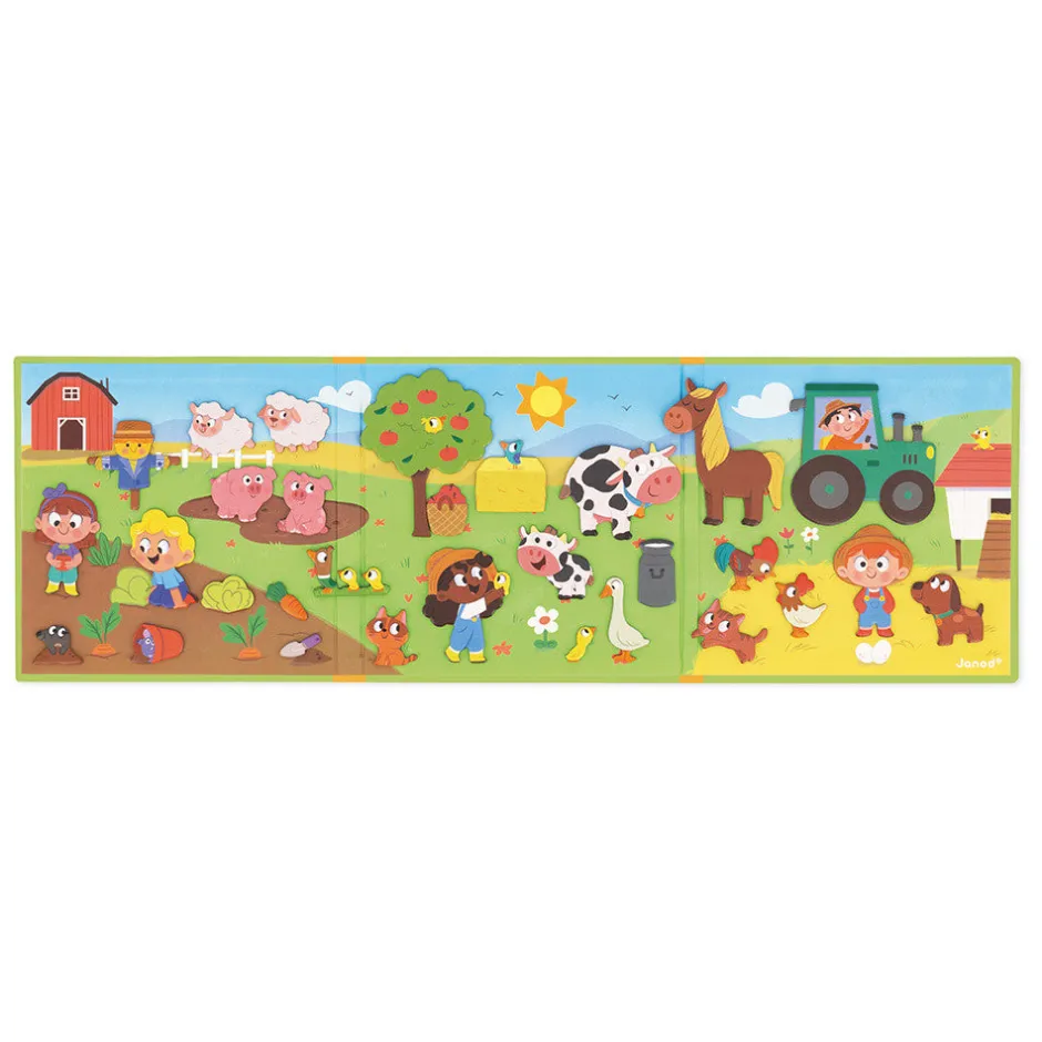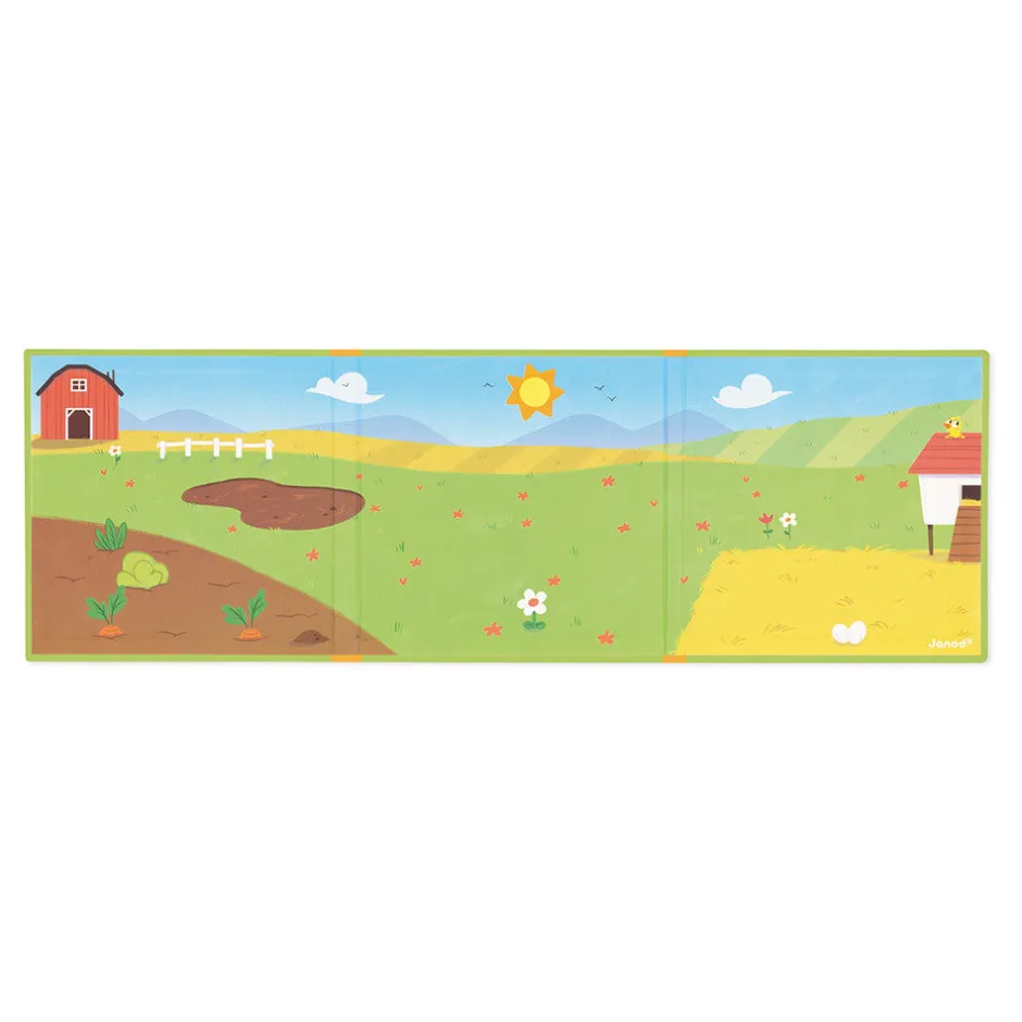 ¡Quiquiriquí, granjerito! El niño puede visitar la granja a partir de 3 años con este decorado magnético ilustrado en el que las cosechas conviven con los cerditos. Este juego magnético consta de un decorado magnético y 30 imanes.