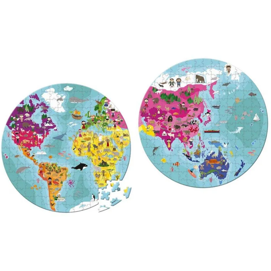 Puzle con piezas de cartón ilustradas a dos caras sobre el tópico planeta Tierra. Ideal para aprender geografía y descubrir la cultura de los diferentes países. Ilustrado con las personas y los animales típicos de cada uno de los continentes.