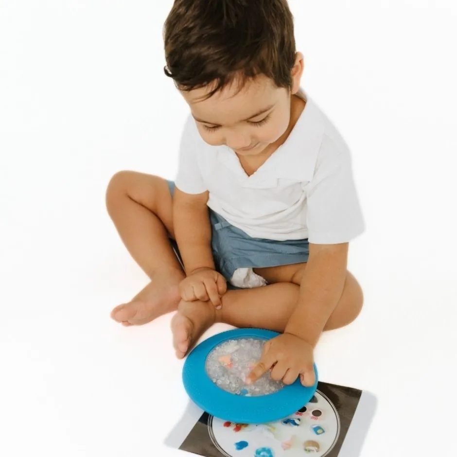 Fabricada con un exterior de silicona texturizada, libre de BPA, y una ventana de plástico duradero, esta bolsa está perfectamente diseñada para activar la vista, el tacto y el oído. Su contenido permite a los niños apretar, estirar y manipular las figuras, ayudándolos a relajarse y calmarse mientras exploran.