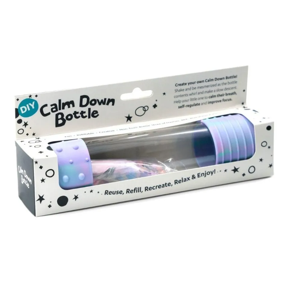 La galardonada botella DIY Calm Down es una botella sensorial única, en la que recibe todos los elementos creativos necesarios para crear una botella sensorial perfecta para su hijo. ¡Simplemente agregue agua tibia y una pizca de detergente líquido y estará listo para usar! Con esta opción, puede rellenar y reutilizar la botella sensorial para disfrutar de infinitas opciones creativas.