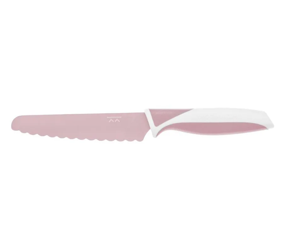 Estos cuchillos están diseñados para niños a partir de los 3 años, para que puedan cortar su comida de forma segura. Cortarán cualquier cosa que un cuchillo afilado pueda cortar, pero no les cortará sus deditos debido a las sierras redondeadas de acero inoxidable. Funcionan con la acción de serrado, pero no corta porque no están afilados.