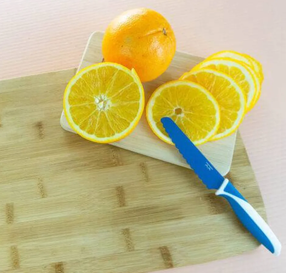Estos cuchillos están diseñados para niños a partir de los 3 años, para que puedan cortar su comida de forma segura. Cortarán cualquier cosa que un cuchillo afilado pueda cortar, pero no les cortará sus deditos debido a las sierras redondeadas de acero inoxidable. Funcionan con la acción de serrado, pero no corta porque no están afilados.