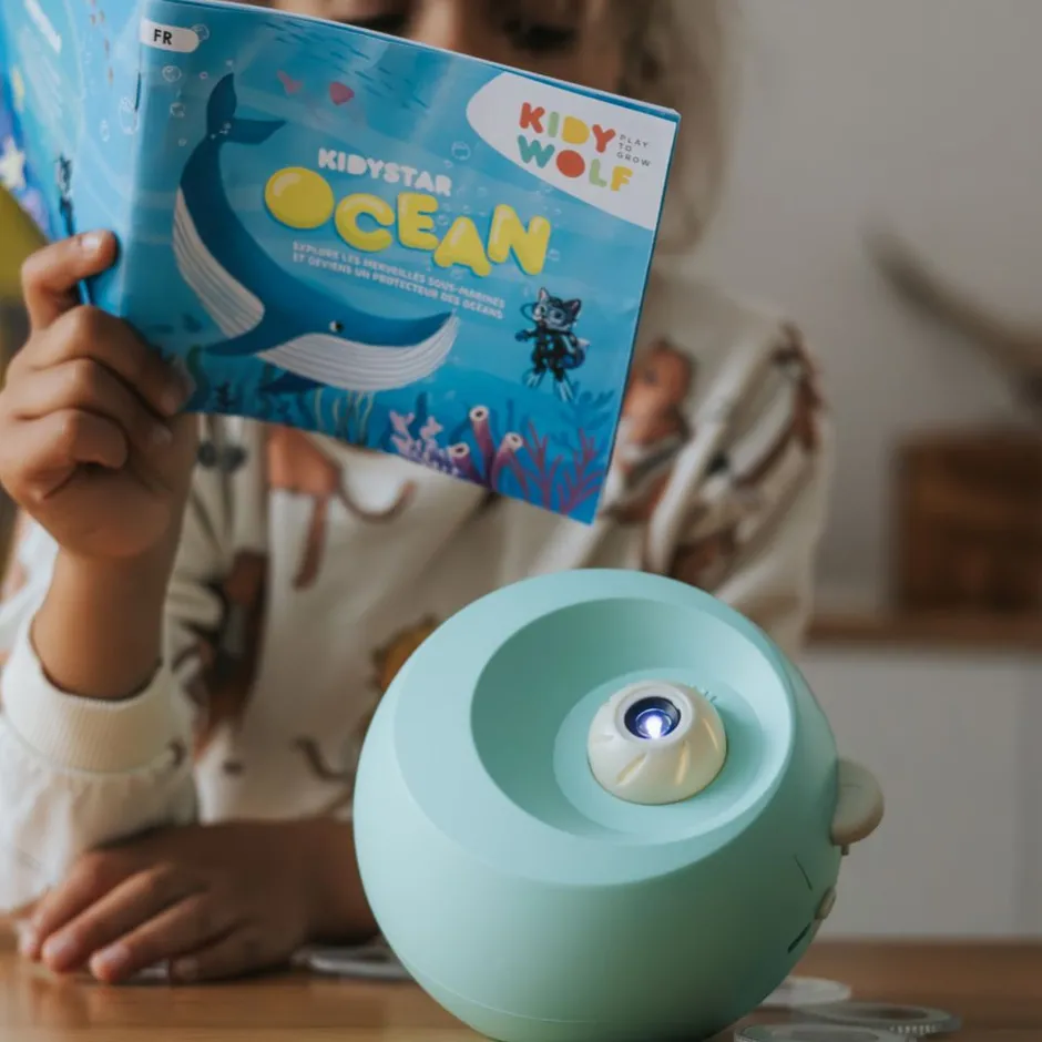 ¡Lleva la magia al dormitorio de tu hijo con KIDYSTAR! Este encantador proyector transforma las paredes y los techos en un cautivador espectáculo de luces con sus seis discos intercambiables. Con su folleto educativo ilustrado, estimula la curiosidad y relaja la mente a la hora de acostarse. Una invitación a la calma, a soñar despierto y a descubrir… para noches llenas de dulces sueños.