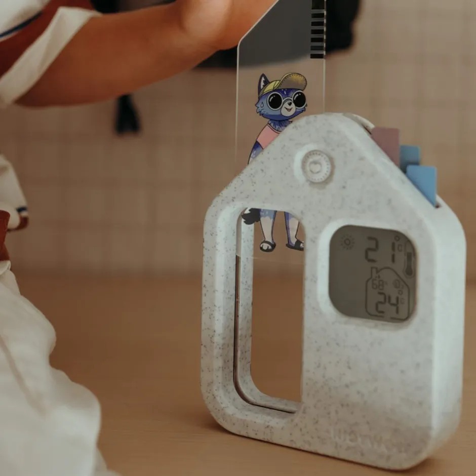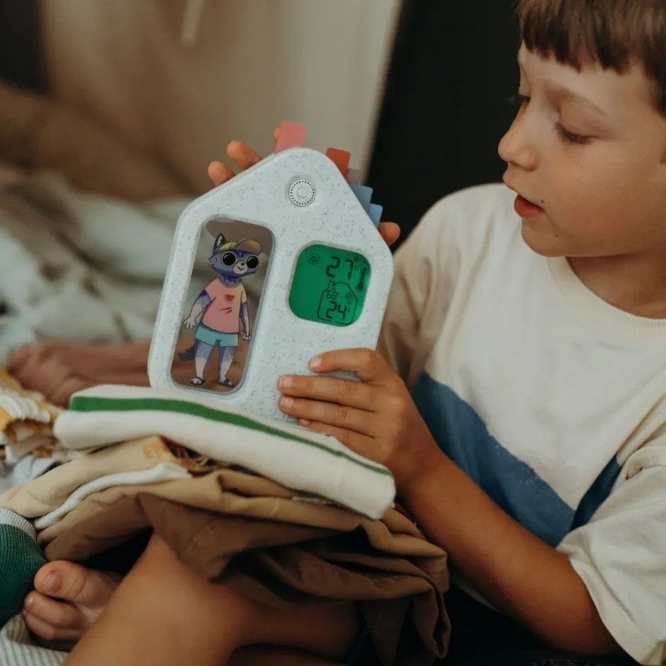 Convierte las mañanas en una divertida aventura con KIDYWEATHER, la estación meteorológica educativa que ayuda a tu hijo a entender el tiempo mientras elige su ropa para el día.